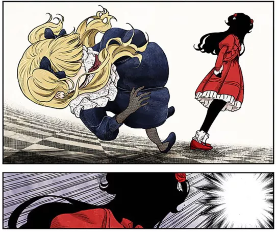 圖上的“兩位”角色是「活人偶」埃米莉可與「影家人」凱特;你沒有看錯,是兩位角色,影宅中並沒有類似《假面騎士龍騎》中“鏡世界”一樣的設定,作者只是用了一個小小的手法將登場的兩位角色聯繫在了一起。