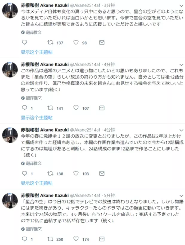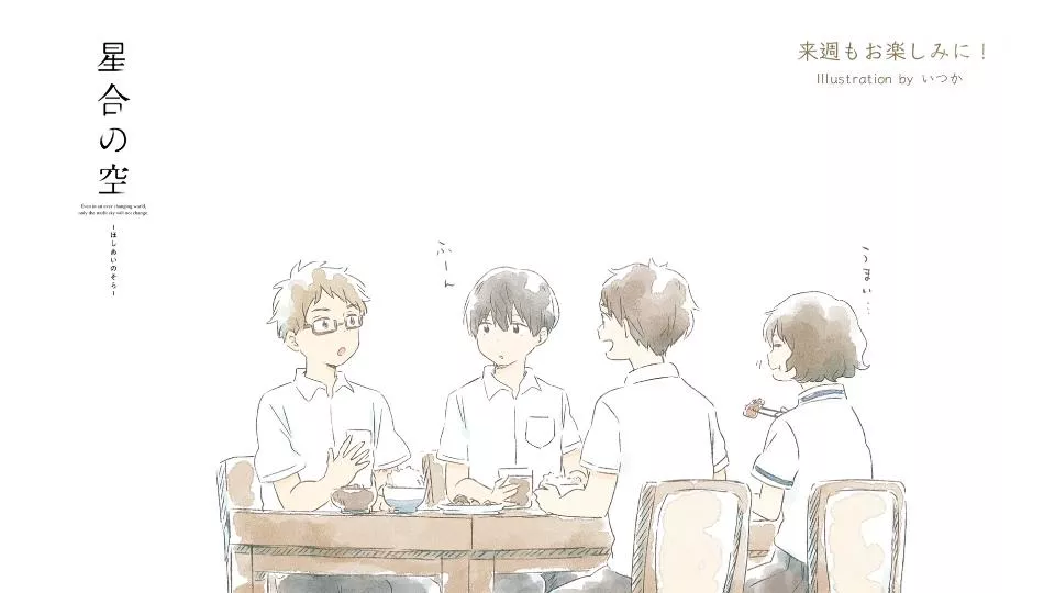 因為接到更改要求的時候動畫已經開始了製作,強行改成12話勢必會給觀眾造成強烈的“割裂感”,赤根和樹最後還是選擇了正常形式製作,最後產出的《星合之空》變成了位數不多的卡在關鍵節點,無法進行下去的原創動畫。