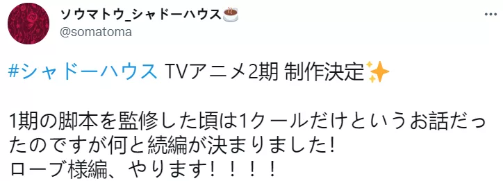 但是《影宅》的原作者「走馬燈」聽到動畫第二季的製作決定的時候除了喜悦還有一點點詫異,“他們也沒跟我説出第二季吖,誰知道就有第二季了呢?”