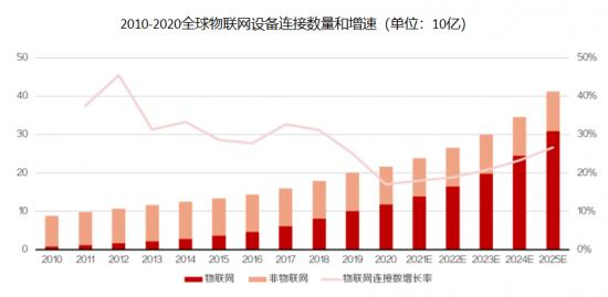 根據IoT Analytics的統計,2020年全球物聯網設備連接數首次超過非物聯網設備連接數達到126億個,預計2025年將達到215億個。此外,根據中國通信院的統計,截至2020年,中國物聯網產業鏈規模突破1.7萬億元,十三五期間物聯網總體產業規模保持20%的年均增長率。《螳螂觀察》認為,受上游物聯網模組成本降低,下游應用更加豐富,巨頭投入增加等因素影響,使物聯網產業鏈日趨成熟,常年保持高速增長。