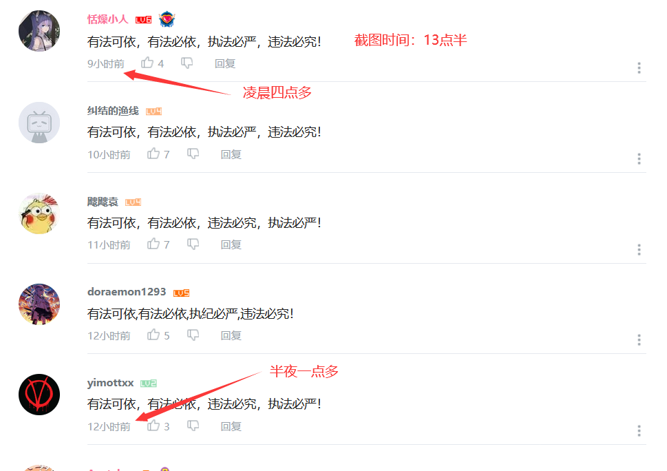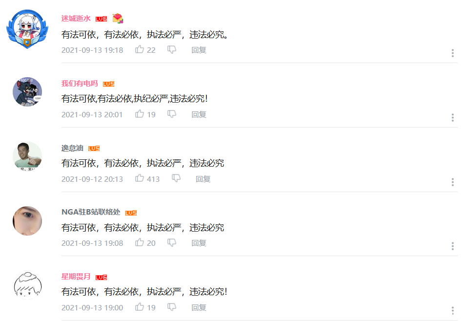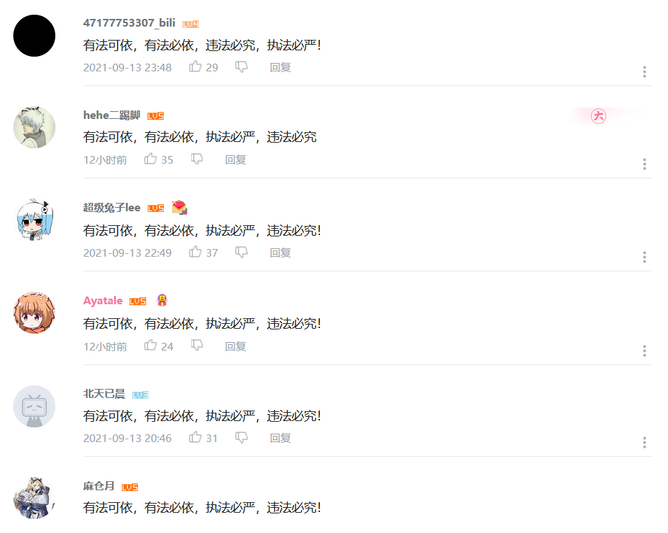 實際上,這種現象在B站不是第一次。新華社的視頻《一幅漫畫,揭批美國病毒溯源報告陰謀》剛發佈的時候,也有許多人在評論區刷“拆除大連日本街”。唯一的不同就是,“拆除大連日本街”的評論意思是顯而易見的,而“有法可依,有法必依”的評論則是需要了解其具體事件才能夠理解其內容的。