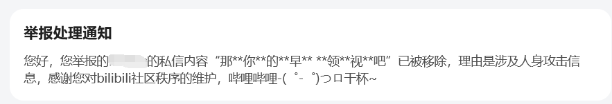 您好,您舉報的私信內容“那**你**的**早** **領**視**吧”已被移除,理由是涉及人身攻擊信息,感謝您對bilibili社區秩序的維護,嗶哩嗶哩-(゜-゜)つロ乾杯~