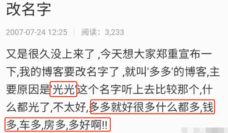 他不想管自己叫“光光”,因為這個名字對沒錢的人來説很不友好,他想給自己改名叫“多多”,很多錢,很多房,很多車。