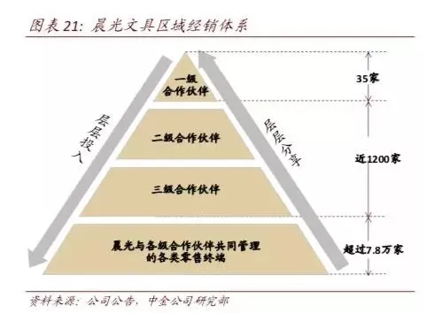 **在體系管理上,晨光文具採用“夥伴金字塔”的營銷模式,強調“層層投入、層層分享”。**簡單來説,即晨光直接對接一級經銷商,一級對接二級,二級對接三級經銷商,以此類推到縣級和鄉鎮市場的經銷,最終由晨光與各級經銷商合作伙伴共同管理零售終端。