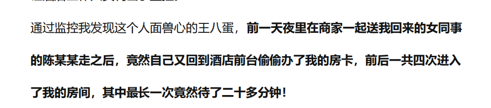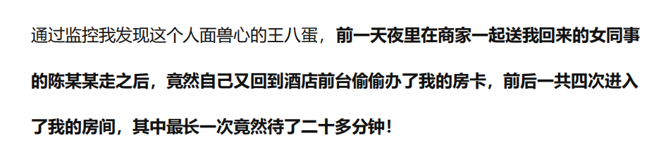周某的小作文裏指出,王某文在吃完飯送她回房間以後,在酒店前台偷偷辦了她的房卡。