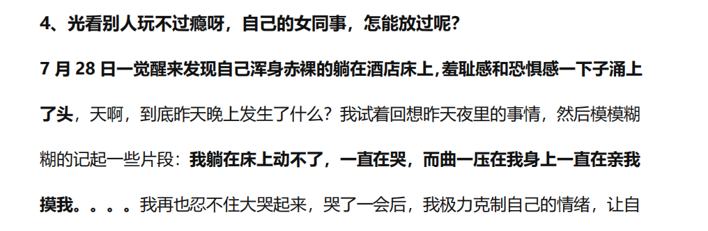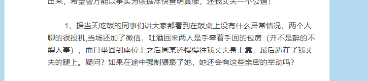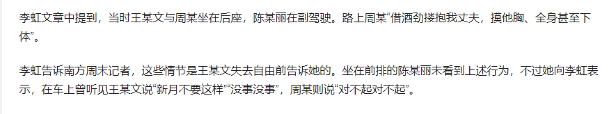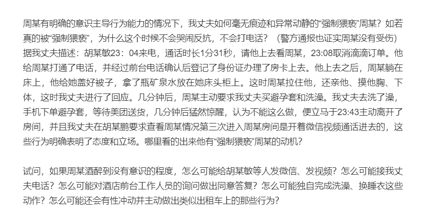 但是在王某文妻子的長文中,出差是周某安排的,酒是周某自己要喝的,她喝完了把酒吐乾淨之後一直在裝醉,然後在車上就猥褻她丈夫,然後多次委託別人把王某文喊去她房間進行猥褻,最後她丈夫回應了一次,就被拘留調查了近三十天,背了個強制猥褻的罪名。