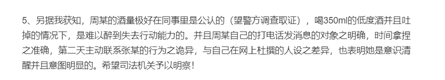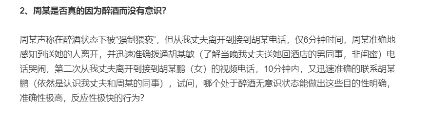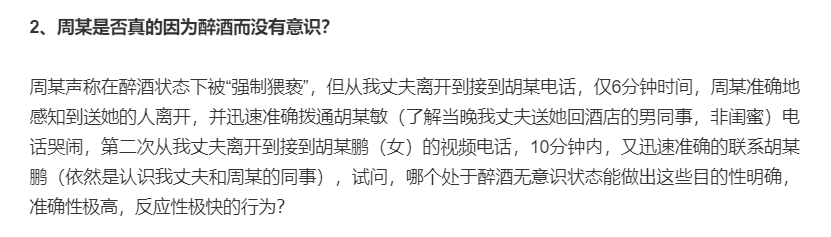 比如她從“周某可以準確打電話”、“洗漱”這些行為,推斷出周某沒醉可能是在裝醉: