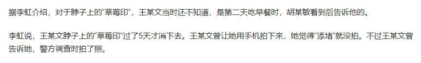 還有證據,説王某文脖子上被親出了“草莓印”,不但另一位阿里女員工看到了,警方取證的時候也拍到了。