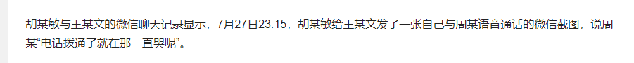 7月27日23:15,胡某敏給王某文發了一張自己與周某語音通話的微信截圖,説周某“電話撥通了就在那一直哭呢”。