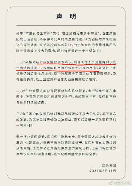 對此,涉事的亞朵酒店表示辦房卡的流程得到了該女士確認,按照同住手續給該男士辦的房卡。