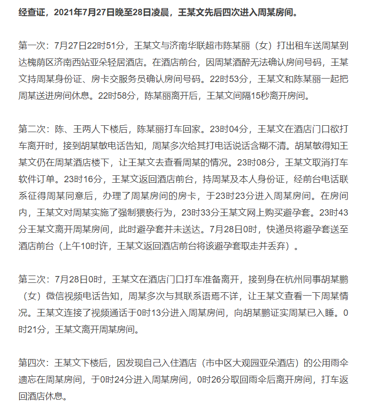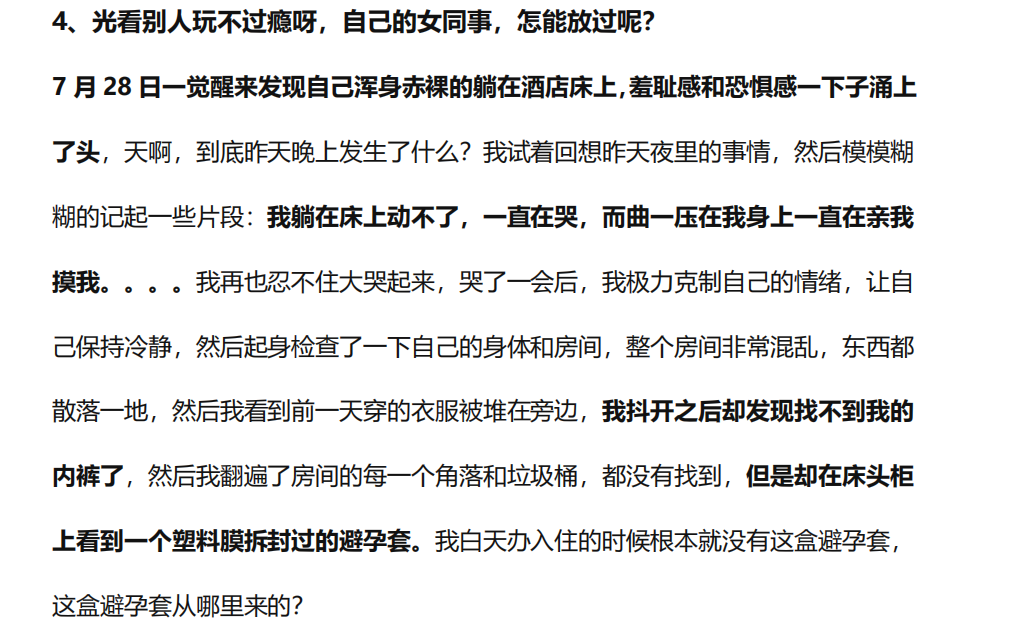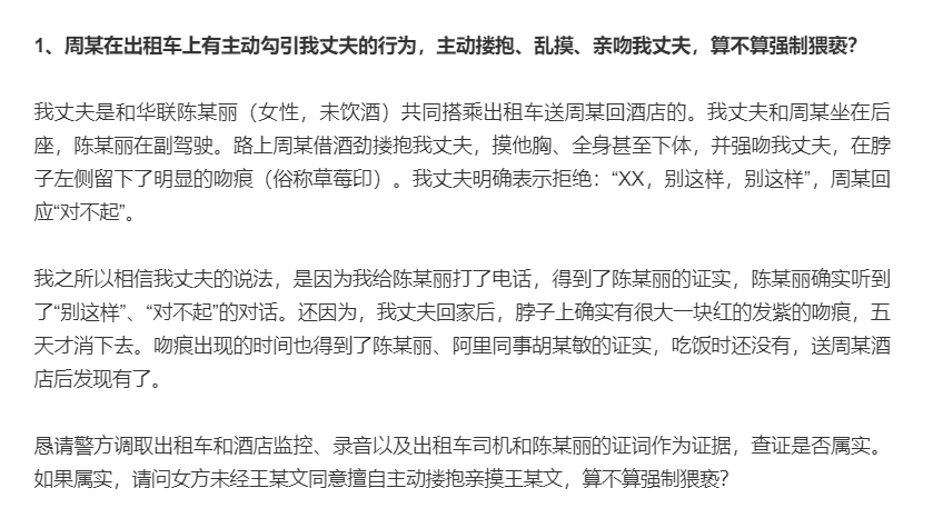阿里周某寫了一篇小作文,長文裏出差是王某文逼她去的,酒是桌上的人逼她喝的,之後發生的一切她都不記得了只記得王某文在房間裏對她進行了猥褻,醒來之後發現自己的內褲消失了,房間裏還有一個開封的避孕套。