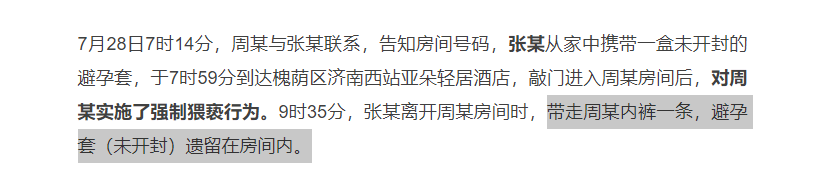 但是根據警方發的“情況説明”,她內褲是7月28日早上濟南華聯的張某帶走的,而這個張某則是她打電話叫來房間的。