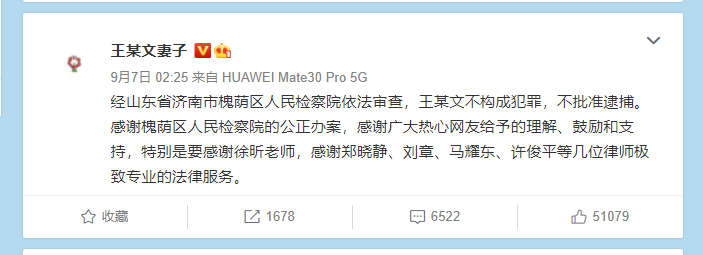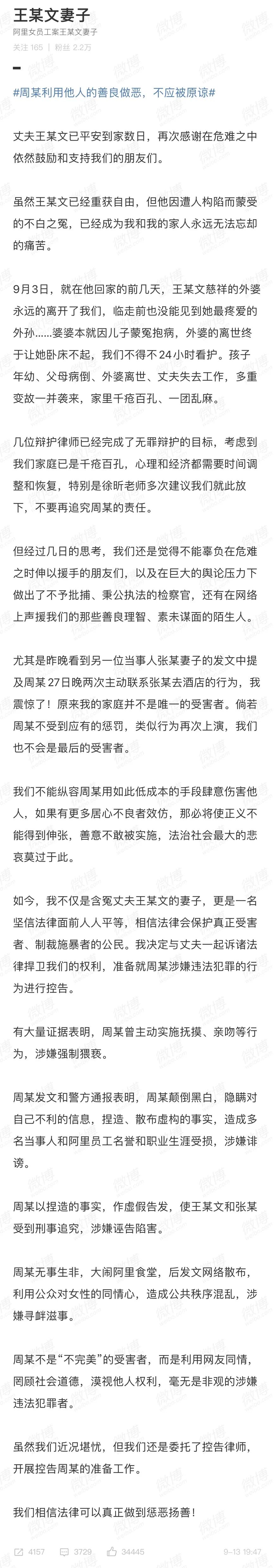 而在王某文正式回家後不久,王某文的妻子更是發了一條長微博,表示要反訴舉報的阿里女員工周某誣陷、猥褻她的丈夫: