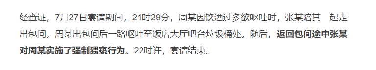 警方通報沒説這些具體的,只證實了張某在返回包間的途中強制猥褻了周某。