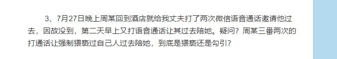 張某的妻子也發微博補充説,其實頭一天晚上週某就給張某打過兩個語音電話喊他過去,但是張某沒去,於是她第二天繼續打電話叫他過去: