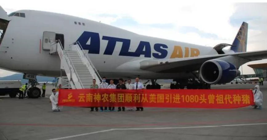 2017年6月13日,1080頭豬從美國芝加哥乘專機,飛行20個小時,抵達昆明長水機場。