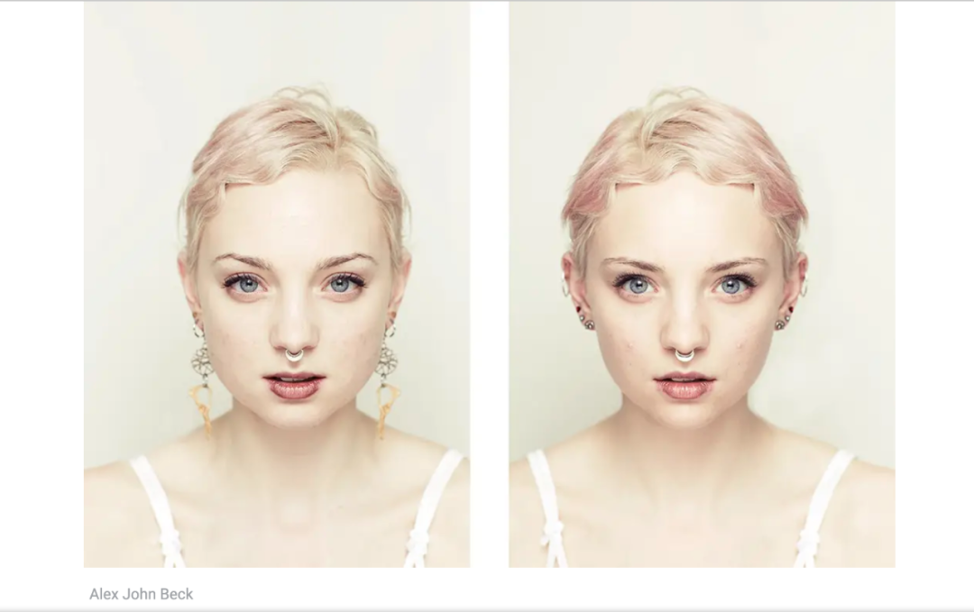 一位攝影師對臉的對稱性很感興趣,於是發起了一個項目,號召各位攝影師利用PS軟件,將之前拍攝的模特肖像照分別做左臉對稱和右臉對稱的處理,按照這樣的方式得到一組精妙對稱的完美臉。這些完美臉被保存在專門的圖庫中。