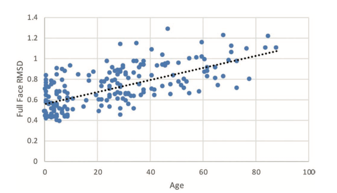 圖中每個點表示一位志願者,橫軸為年齡,縱軸為面部不對稱指數 (圖 Linden. 等)