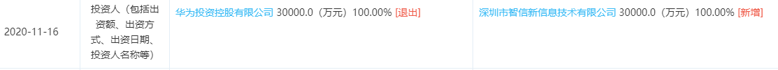 天眼查信息顯示,2020年11月16日,榮耀終端有限公司投資人出現變更,由華為投資控股有限公司變更為深圳市智信新信息技術有限公司。
