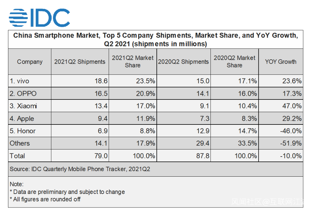 IDC近期發佈的手機季度跟蹤報告顯示,2021年第二季度中國智能手機市場國產手機廠商裏,榮米OV的市佔率躋身前五,華為已被歸類到其他手機廠商。IDC中國客户端系統研究經理王希表示:“儘管前四名廠商(蘋果、小米OV)在2021年Q2實現了顯着增長,但華為留下的空白仍然無法完全填補。”