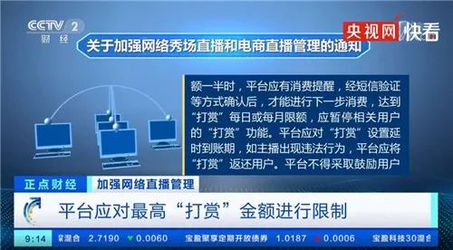 去年11月,國家廣播電視總局就曾發佈《關於加強網絡秀場直播和電商直播管理的通知》,要求主播和“打賞”用户實名,平台對用户每次、每日、每月的最高打賞金額進行限制,在打賞達到限額一半時要發短信和用户確認。