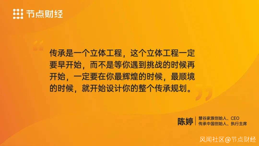 我認為傳承是一個立體工程,這個立體工程一定要早開始,而不是等你遇到挑戰的時候再開始,一定要在你最輝煌的時候,最順境的時候,就開始設計你的整個傳承規劃。