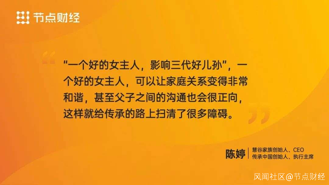 家族的三個基本成員,父親、母親、孩子,我認為都應該覆蓋到,才能形成一個比較穩定的閉環。所以當時我們説,要影響第二代接班人,同時要影響女主人。我是女性,我見到太多的大家族女性角色的重要性,包括李錦記家族,包括新希望集團劉暢的媽媽,我認為在背後對她的傳承起了舉足輕重的作用。“一個好的女主人,影響三代好兒孫”,一個好的女主人,可以讓家庭關係變得非常和諧,甚至父子之間的溝通也會很正向,這樣就給傳承的路上掃清了很多障礙,所以我覺得女性的成長特別重要。