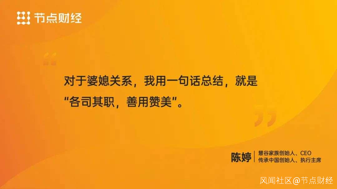 我經常講,讚美婆婆的這個功效有多重要。其實我們中國人羞於表達,尤其婆媳之間,往往在你心裏可能是這麼想的,但你又不好意思説,各種瑣碎的誤會越積越深,最後甚至變得很嚴重,讓自己的另一半很為難。我自己可能還加上家庭教育,我母親跟我奶奶的關係就非常好,我覺得在這裏面的用一句話總結,就是“各司其職,善用讚美”。