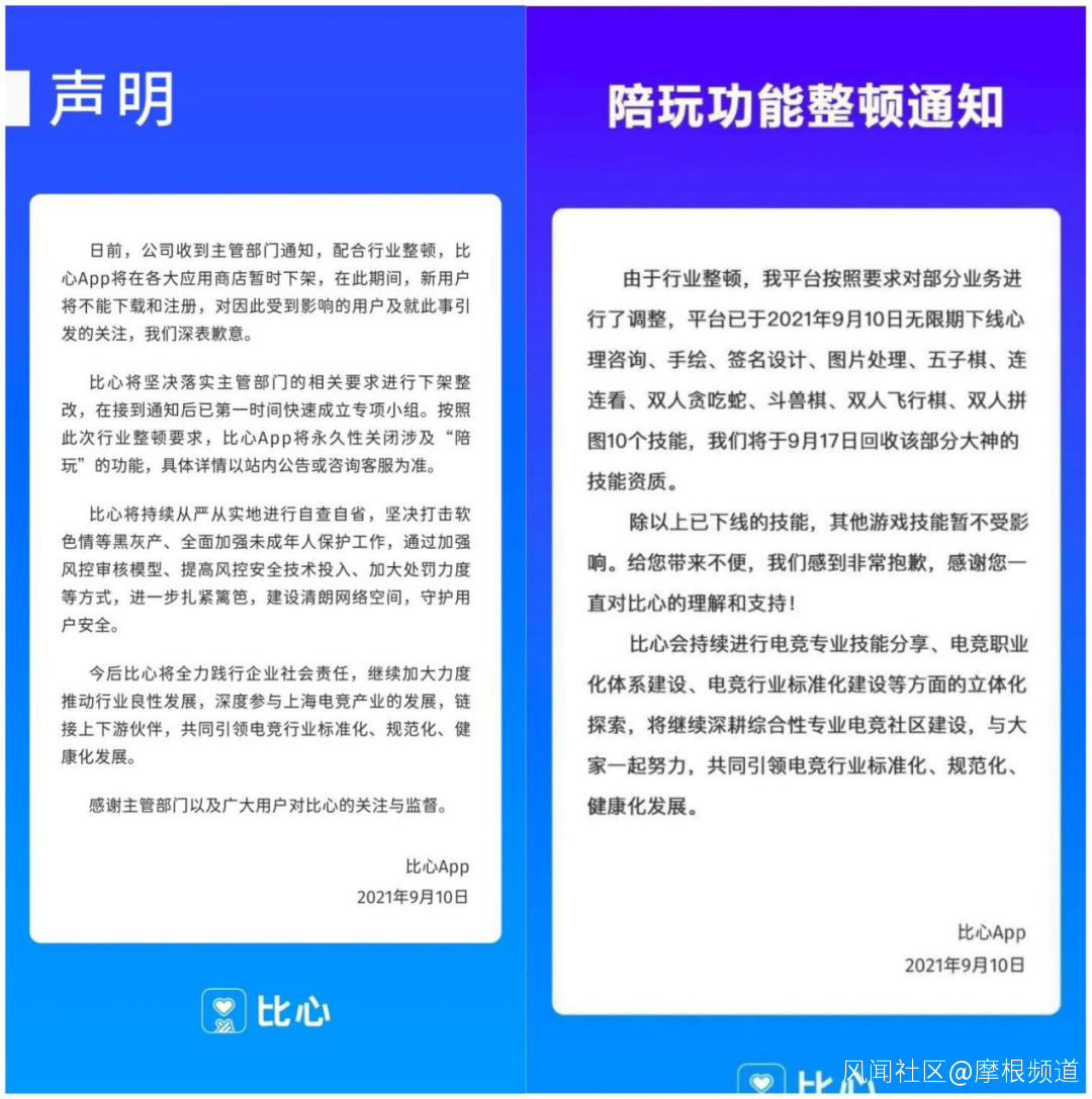 9月10日,比心App發佈聲明,為了配合行業整頓,比心App將在各大應用商店暫時下架,在此之間,新用户將不能下載和註冊。同時,按照此次行業整頓要求,比心App將永久性關閉涉及“陪玩”功能。