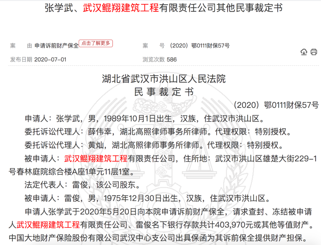 據澎湃報道,去年5月薛律師接受4位申請人的委託,向法院申請並最終由該院裁定凍結、查封嫌犯雷俊名下約120萬的財產及不動產。