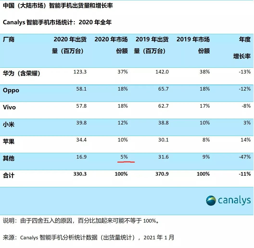 根據Canalys數據統計,2020年國內智能手機市場全年出貨量3.3億台,排在前五名的,分別是華為(含榮耀)、OPPO、vivo、小米、蘋果。這五名全年拿走95%的市場份額,留給市場上其他所有廠商僅有約5%的市場份額。