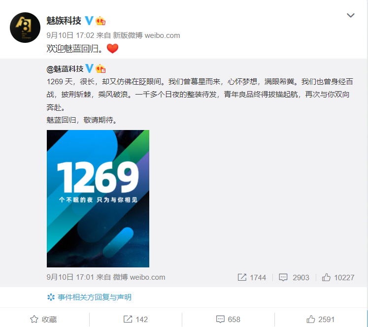 之所以如此,正是魅族在三天前正式官宣,時隔1269 天,魅藍迴歸。