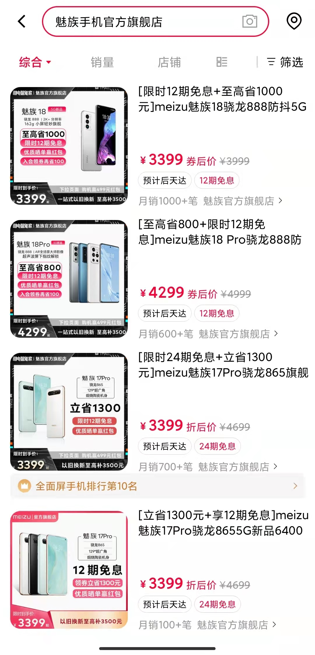 天貓上亦如此。魅族天貓官方旗艦店中,魅族18月銷僅1000+筆,魅族18 pro 月銷僅600+筆。