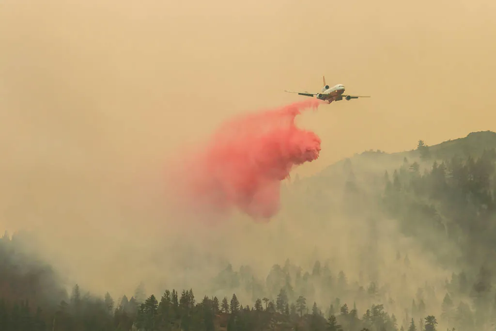 2021年8月20日,美國加州,迪克西山林大火持續,消防飛機空中救援