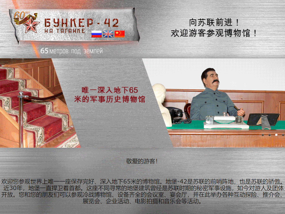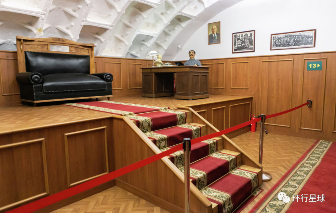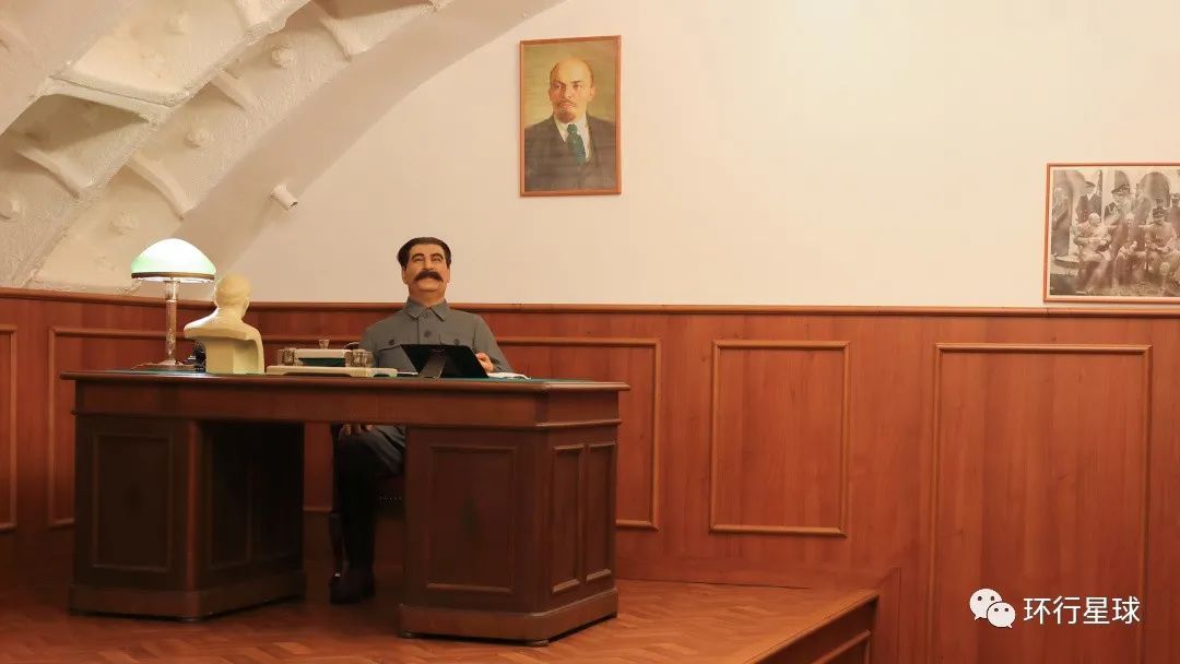 42號地堡雖然也叫斯大林地堡,但它在1956年才完工,而斯大林1953年就去世了,所以他本人根本沒使用過這間辦公室。現在房間仍然按照斯大林風格佈置,裏面擺放着一張黑色的長沙發,辦公桌後面還有斯大林的蠟像。
