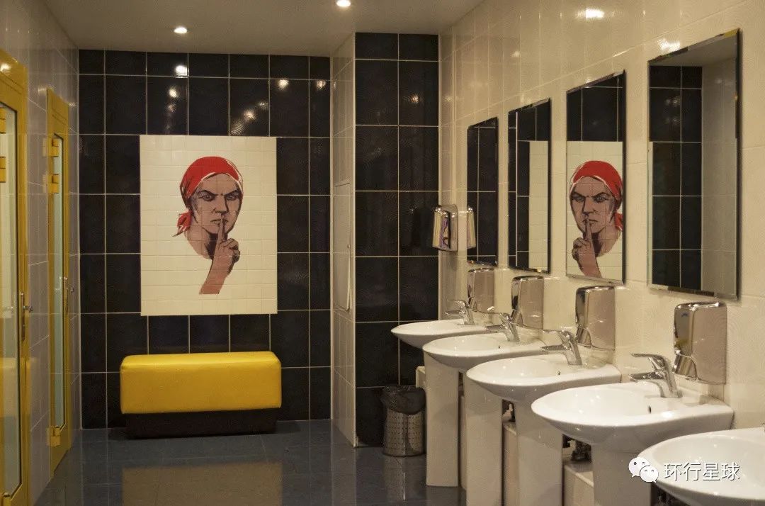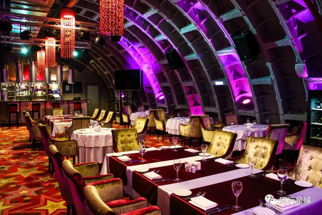 在受了一番刺激和驚嚇之後,參觀者們此時剛好走到餐廳,自然要平息一下緊張的情緒。隧道的盡頭是一間“前蘇聯風格”的餐廳,這裏的主題是紅五星,不但地上鋪着紅五星地毯,穹頂上也有一顆碩大的紅五星。