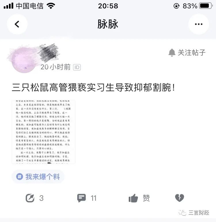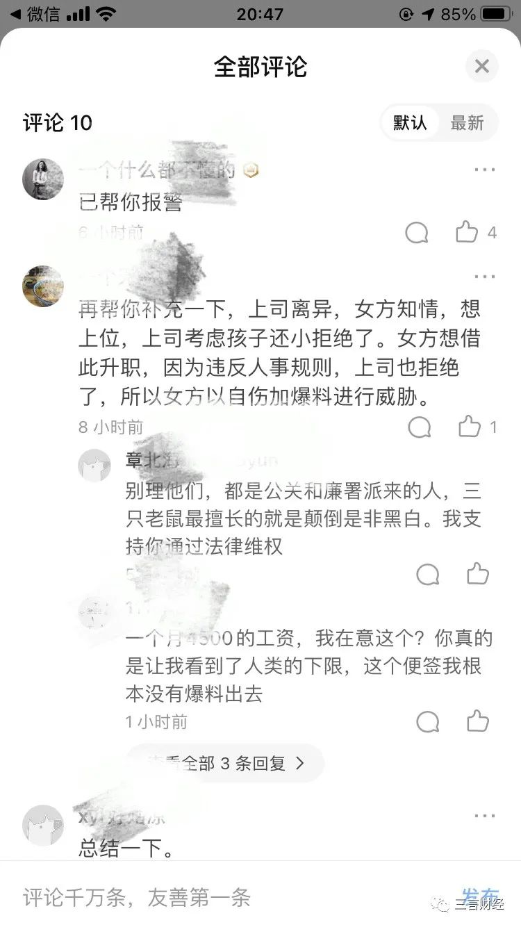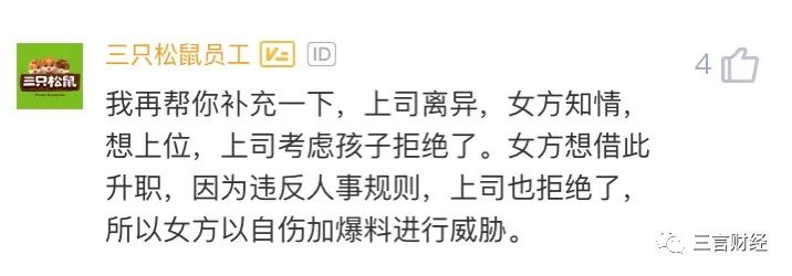 在脈脈上,該爆料消息的評論區有認證為三隻松鼠員工的網友稱,上司離異,女方知情,想上位,上司考慮孩子拒絕了。女方想借此升職,因為違反人事規則,上司也拒絕了,所以女方以自傷加爆料進行威脅。
