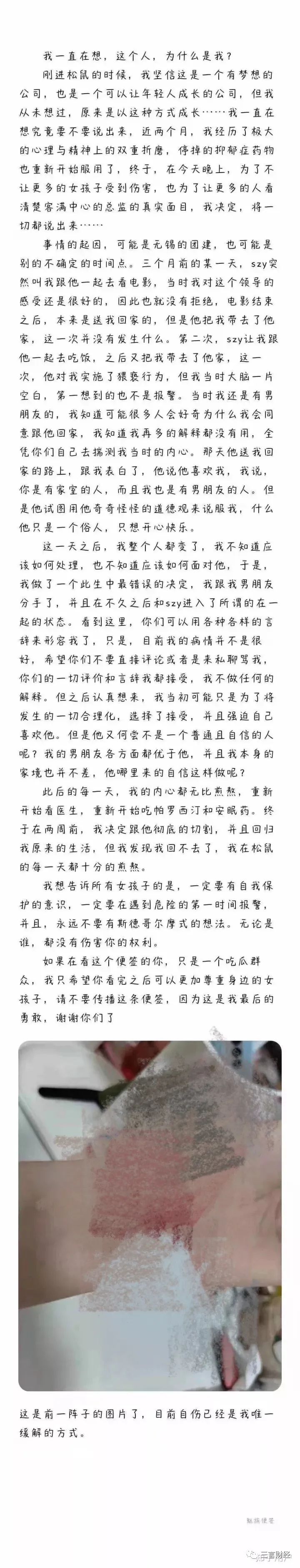 該網友在文中稱,三個月前的某一天,三隻松鼠客滿中心總監szy突然讓自己跟他一起去看電影,電影結束之後還把自己帶回了家,這一次並沒有發生什麼。