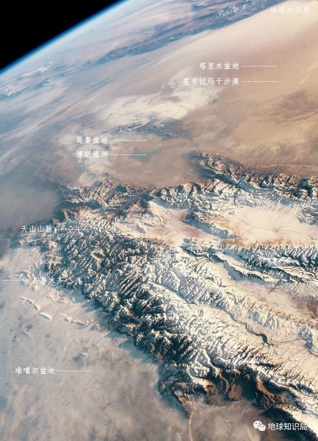 白雪皚皚的天山山脈與南邊的沙漠形成了鮮明對比