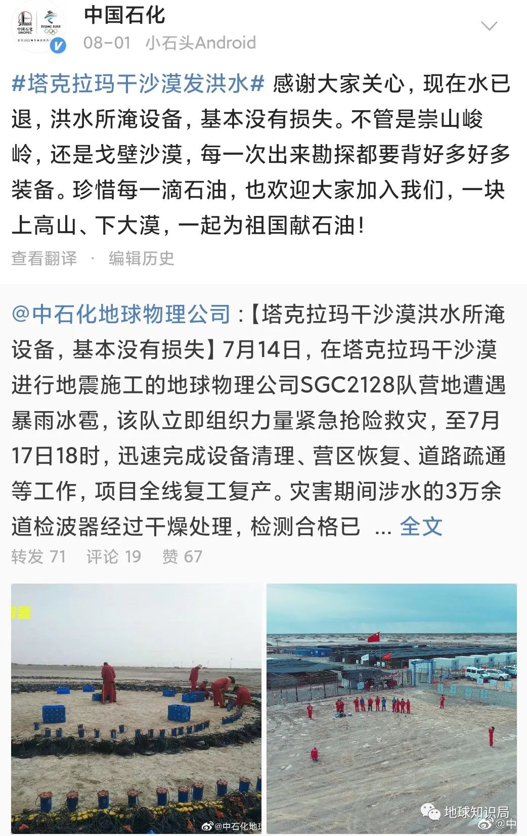 此次塔克拉瑪干沙漠北緣發生洪水的主要原因,是天山南坡迪娜爾山二八台河上游山區發生了較強降雨,形成了小流域洪水。至於在當地作業的中石化,沒有像網上説的那般損失巨大。實際上,石油部門包括地勘部門的損失有限,泡水的車輛和設備浸水時間不長,基本不影響使用。