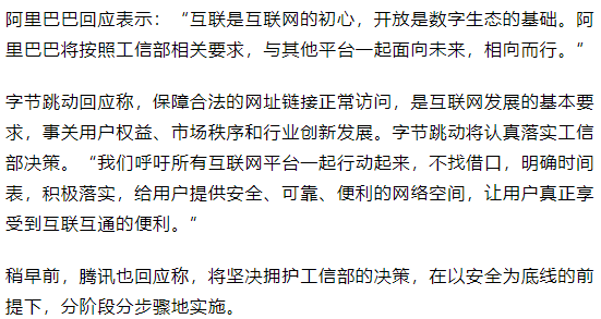 大概翻譯一下:就是會全力支持這次的整治行動,在以安全為底線的前提下,分階段分步驟地實施網址鏈接互聯互通。