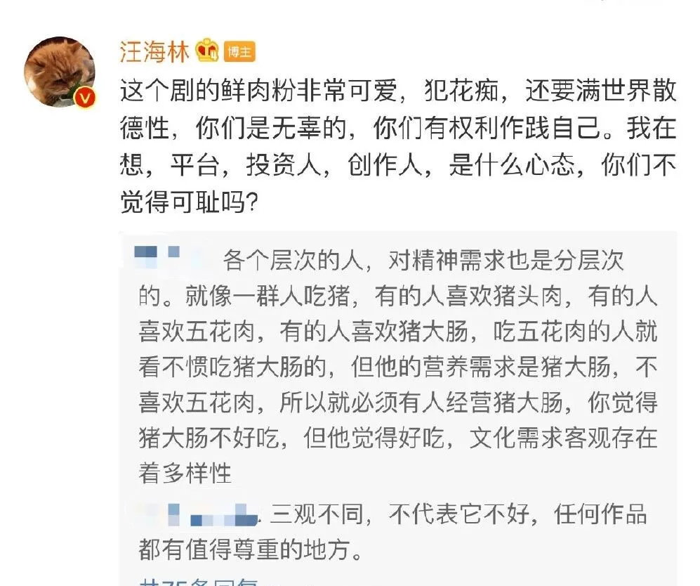 **汪海林:**背後是出於某種恐慌,就是有些明星的粉絲吧,他有點恐慌,他會發現我經常有發聲或者有發聲的機會,或者是有參與一些會議的機會,他擔心我在會上提他的愛豆。他們出於恐慌呢,他不知道該怎麼辦,他的辦法就是説讓你參加不了這些會,那這個辦法就是什麼呢?我詆譭你,或者是造成你的形象受損,這樣你就參加不了這些會了。我認為他是這個邏輯。