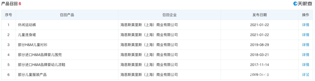 此外,天府財經網注意到,H&M還有6次產品召回記錄,並且召回的產品均為兒童服裝類。