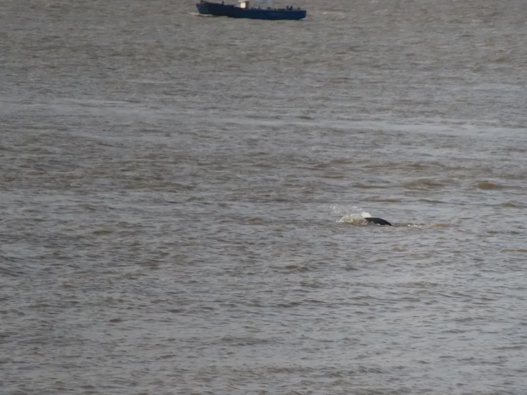 但這時,在貨船的不遠處,一個圓溜溜地腦袋濺起了銀白色的水花,一隻、兩隻、三隻,是長江江豚,一對母子和一隻稍大的成體,它們一直在大橋下的水域裏撲騰,一會探出頭,一會弓起脊背,一會來個側翻。