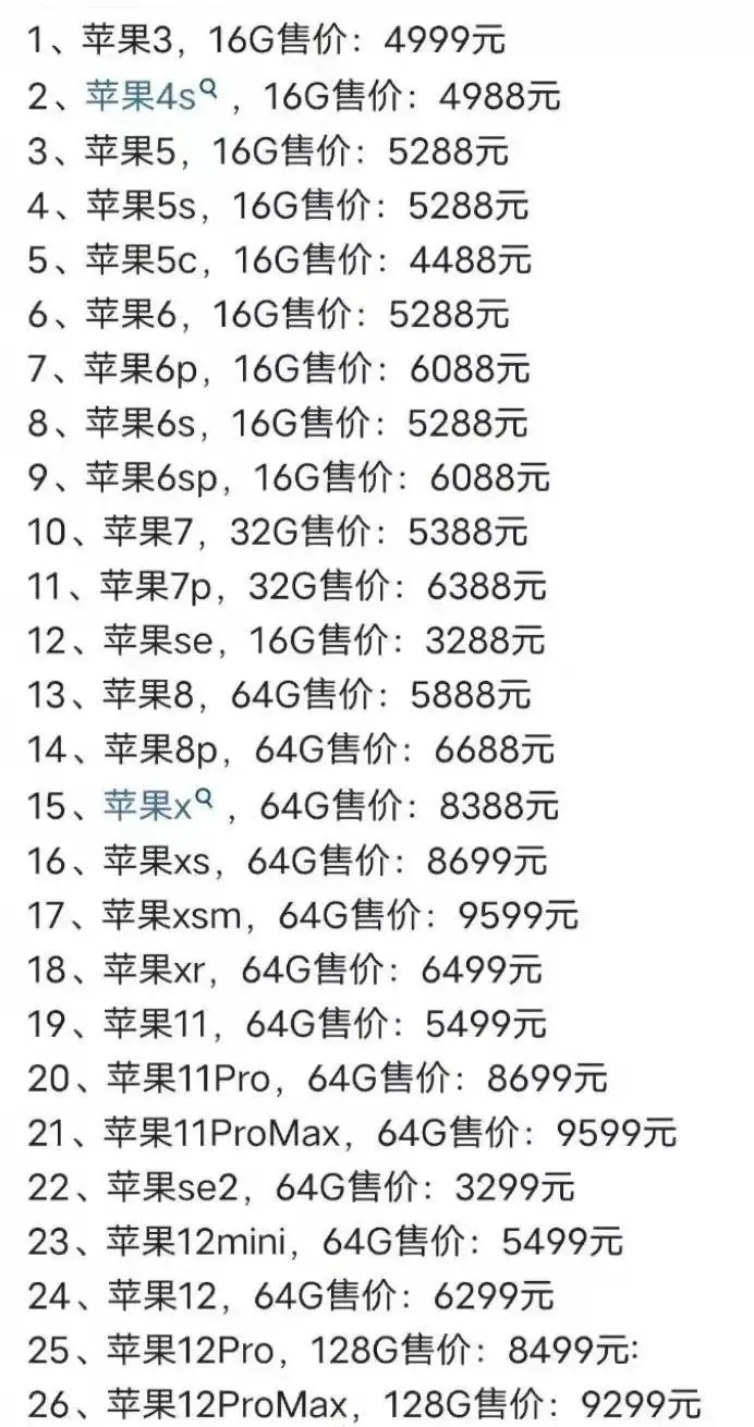 iPhone11 64G版5499、iPhone12 64G版6299、iPhone13 128G版5999。