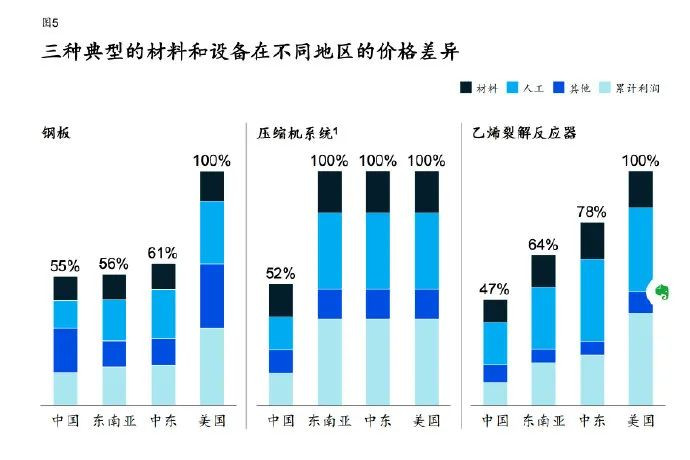 **第二是產業結構優勢(累計利潤)****:**貢獻了成本差異的34%。由於中國具備完整的製造業價值鏈,且各環節附加的利潤顯著低於其他國家或地區,中國的工程項目支付給價值鏈的累計利潤處於較低水平。我們的原材料和設備也要更便宜,在類似的項目中,中國所用的鋼材成本、壓縮機系統以及乙烯裂解反應器都要比其他地區便宜。