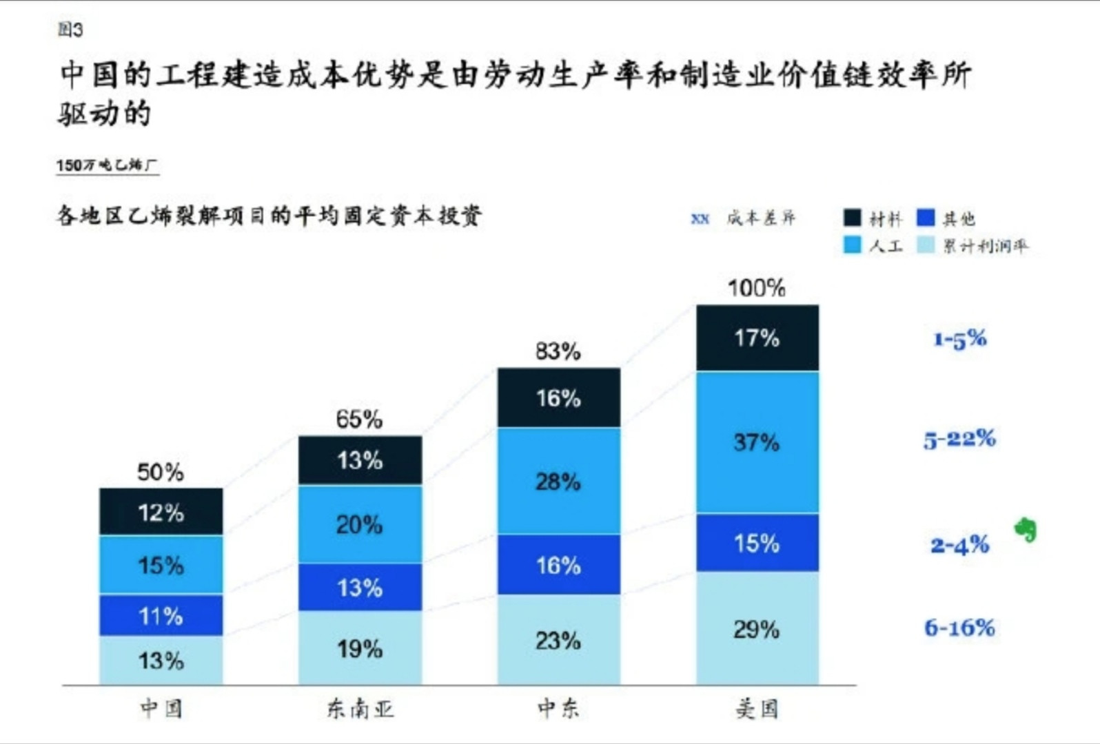 中國的地方政府和企業似乎比國外的同行們更擅長建工廠。有國外諮詢公司做過一個分析:中國的工程公司經過大量的工程實踐,在細分工程領域積累了豐富的項目經驗和專業能力,依託國內人數眾多、能力出色的工程師和技術工人隊伍和覆蓋完整、競爭力強的製造業,通過不斷“複製和迭代”,形成了快速、低成本的建設模式,造就了中國工程建設的成功故事。以同等規模的乙烯裝置為例,在中國的建造成本比其他地區低25%~60%,同時工期短20%~40%。麥肯錫做過一個拆解,在分析中國和其他地區的成本構成後發現,中國投資效率高主要有兩大決定因素(以美國為例):**第一是勞動力成本:**貢獻了成本差異的44%。中國的單位人工成本為美國的20%~40%,而勞動效率水平相近。
