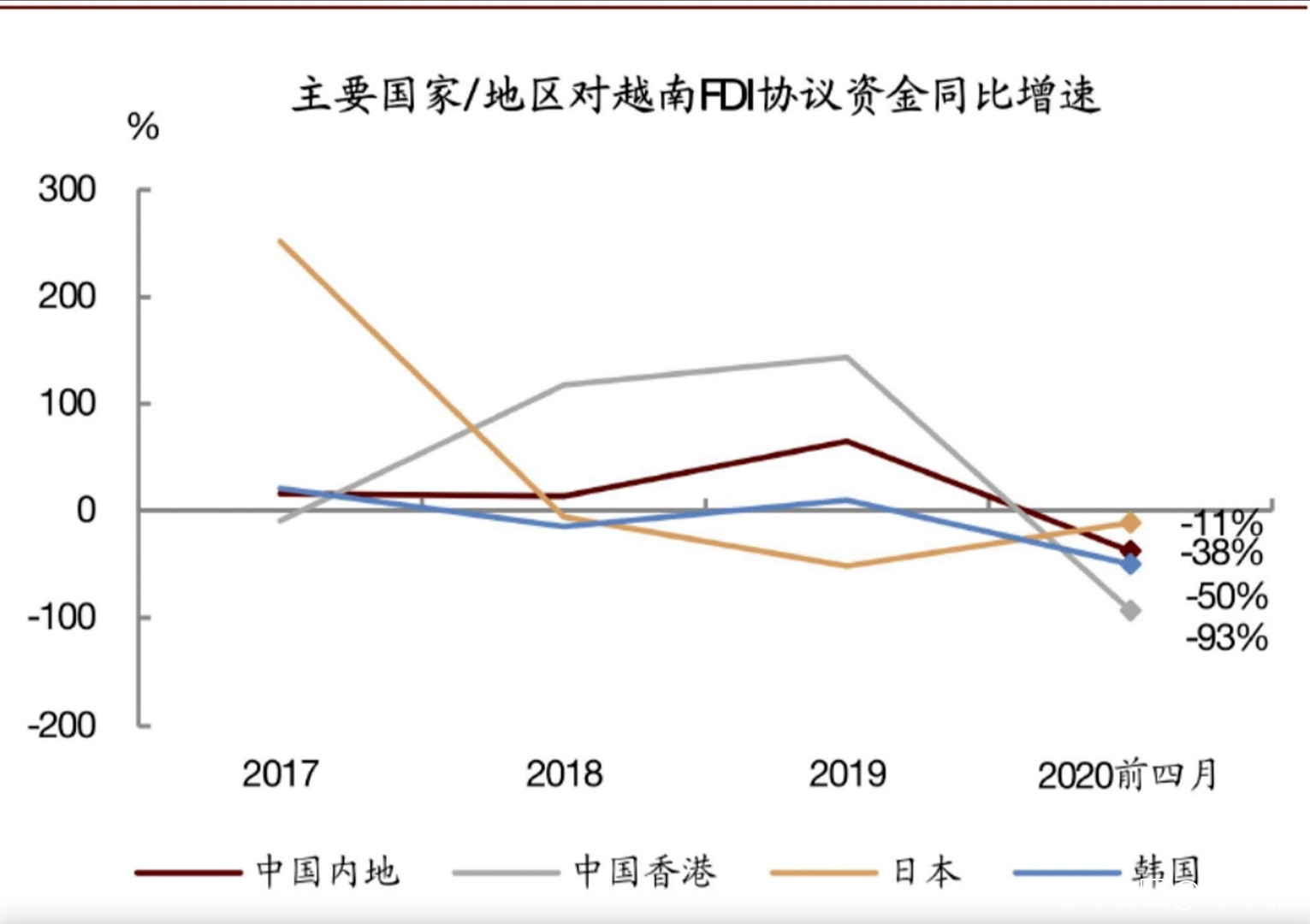 2019年,美日資本開始加快進入越南。從外商直接投資角度看,2010-2019 年越南吸收 FDI 協議資金年複合增速達 7%,其中,製造業吸收 FDI 協議資金年複合增速高達 17%。值得一提的是,2019 年越南製造業吸收 FDI 金額約 250 億美元,同比增速高達 48%,佔全部 FDI 協議資金的 65%。