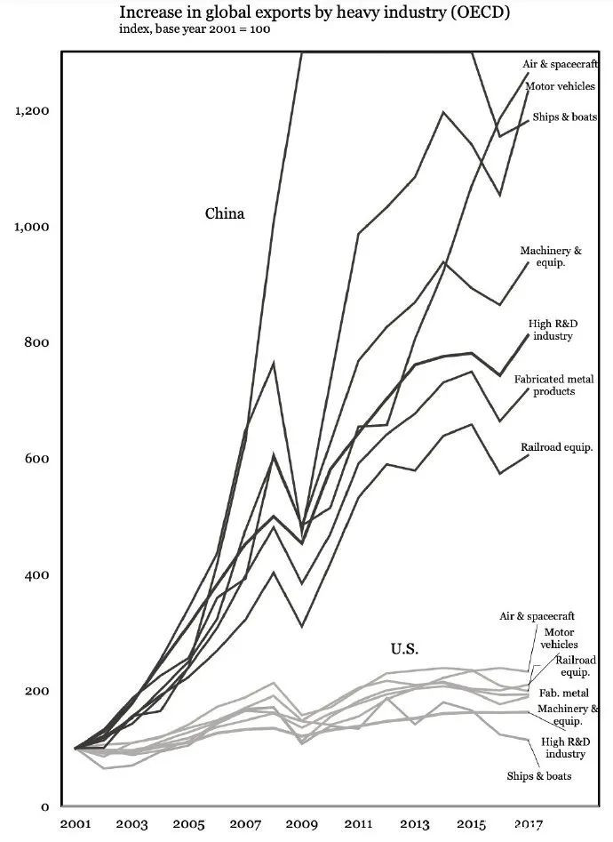 2017年年初,美國參議院小企業和企業家委員會主席馬可•盧比奧(Marco Rubio)向參議院提交的一份最新報告中,重點評估了中美兩國製造業不同產品的出口份額。兩國的重工業產品,如航空航天、機動車、船舶、機械裝備、高科技產品、人造金屬製品及鐵路裝備的出口增長指數,中國遙遙領先其他國家。到2017年,**這幾個領域最低漲幅為5倍,排名前三的航空航天、機動車和船舶的出口數量增加了10倍以上。**在高附加值的機器設備,雖然我國整體落後,但增長明顯,比如數控機牀和機器人領域。