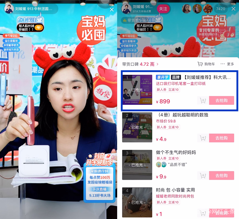 此外,劉媛媛在直播間推介科大訊飛翻譯筆S10時,在內容端通過“英語考試取消”話題講述學習英語的高成本,並在直播間講解翻譯筆精準點讀等功能,輔以899元的低成本,與一年少吃四頓火鍋作等價對比,刺激父母的教育消費慾望,帶動了該商品的銷量。